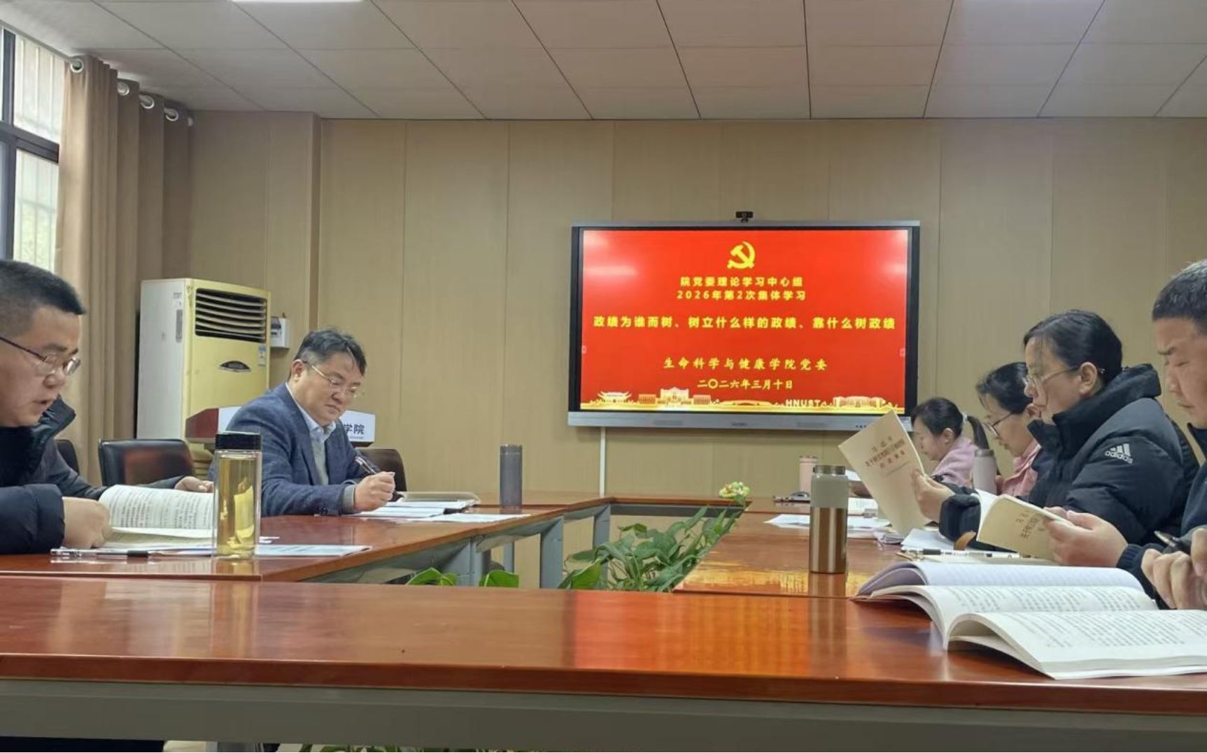 3月10日下午,足球直播吧 党委理论学习中心组在生物楼110举行2026年第二次集体学习(扩大)会,深入学习贯彻习近平总书记关于树立和践行正确政绩观的重要论述精神,传达落实中央、省委党的建设工作领导小组会议精神。院党委书记龙赢主持会议并作总结发言,足球直播吧 党委理论学习中心组成员、三办主任、教工党支部书记、组织员参加学习。