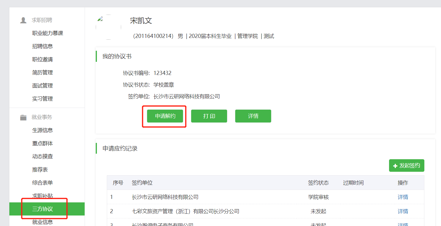 第六步:等待学生应约,以及学校审核通过后(都会有微信通知及后台通知),即可登录后台,打印三方协议,盖章邮寄给毕业生。