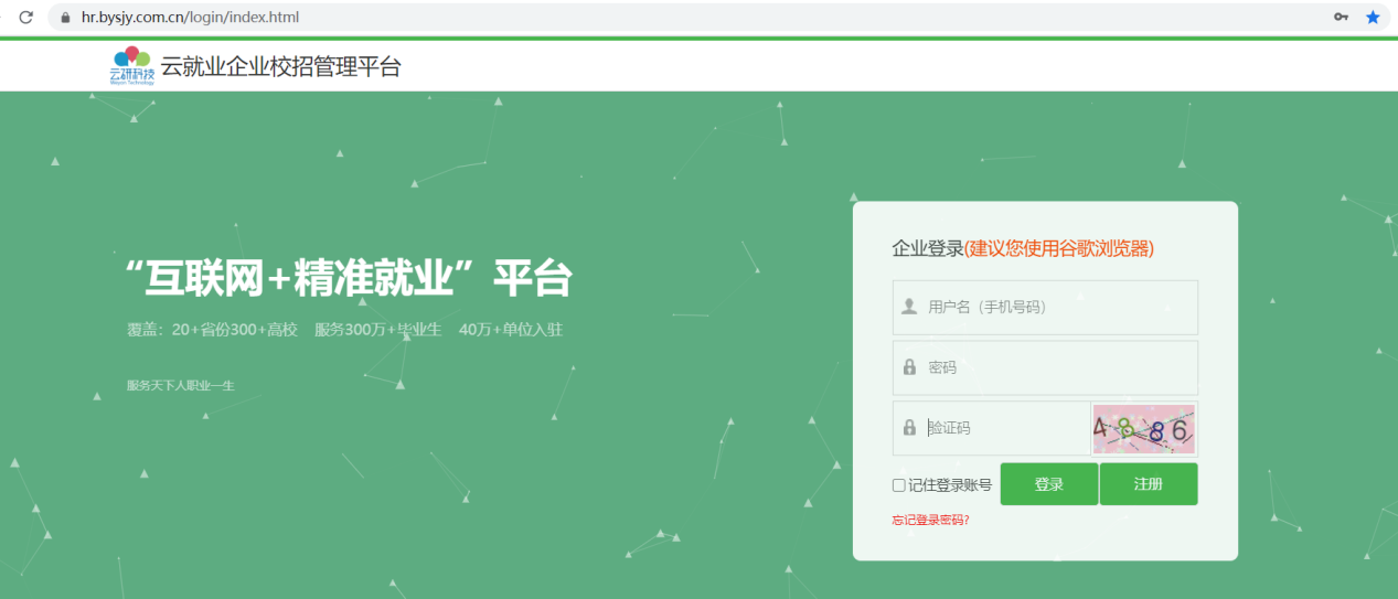 第一步:登陆云校招企业服务平台(//hr.bysjy.com.cn/login/index.html)没注册账号的,点击页面上注册按钮先行注册,等审核通过后再进行网签。
