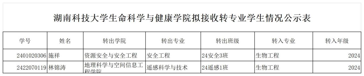 根据《湖南科技大学普通全日制本科生转专业管理办法(试行)》(科大政发〔2024〕81号)和《足球直播吧 转专业管理办法》(院发〔2024〕38号)等文件精神,经学生本人申请、转专业工作领导小组面试、教务办审查,拟同意施祥、林锦涛2名同学由外院转入360直播足球直播 生物工程专业学习。现将转专业名单进行公示。