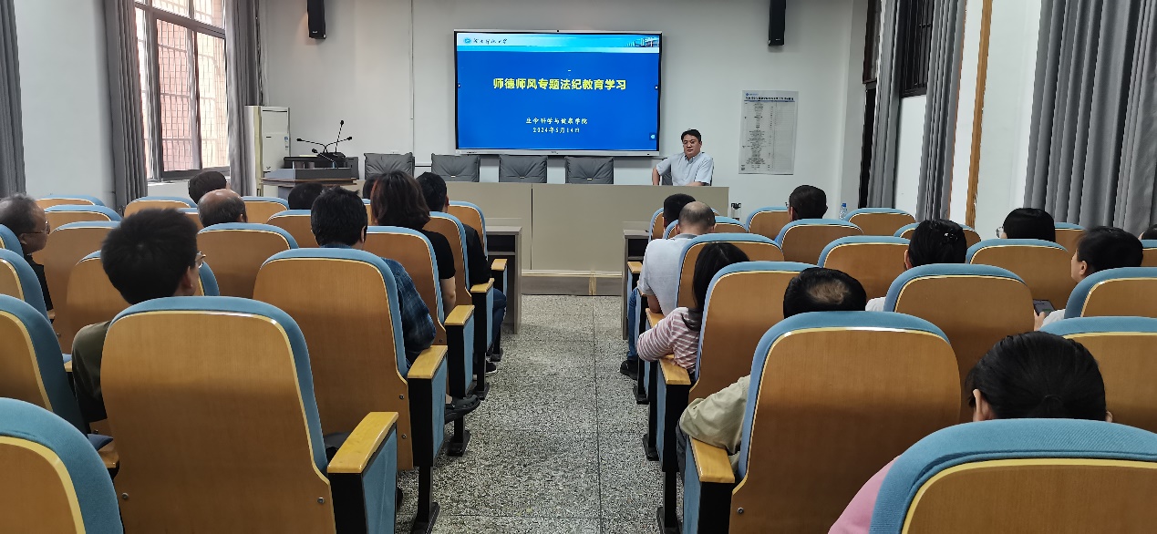 在学校开展党纪学习教育中,360直播足球直播 借机狠抓强化师德师风专题法纪建设。5月14日下午在105会议室开展师德师风专题法纪教育学习,院党委书记龙赢主持会议,全院教职工参加。
