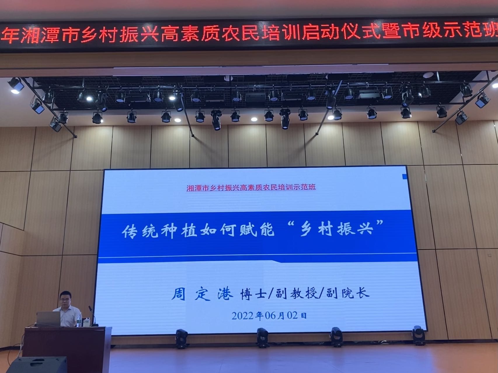 6月2日上午,360直播足球直播 副院长周定港副教授在2022年湘潭市乡村振兴高素质农民培训市级示范班开讲。本次乡村振兴高素质农民培训示范班由中共湘潭市委组织部主办,湘潭生物机电学校承办。