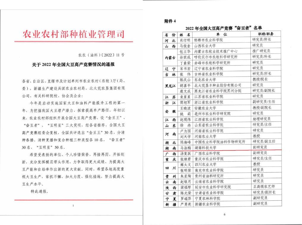 马淑梅副教授(原副研究员)荣获“2022年全国大豆高产竞赛“奋豆者”奖项。