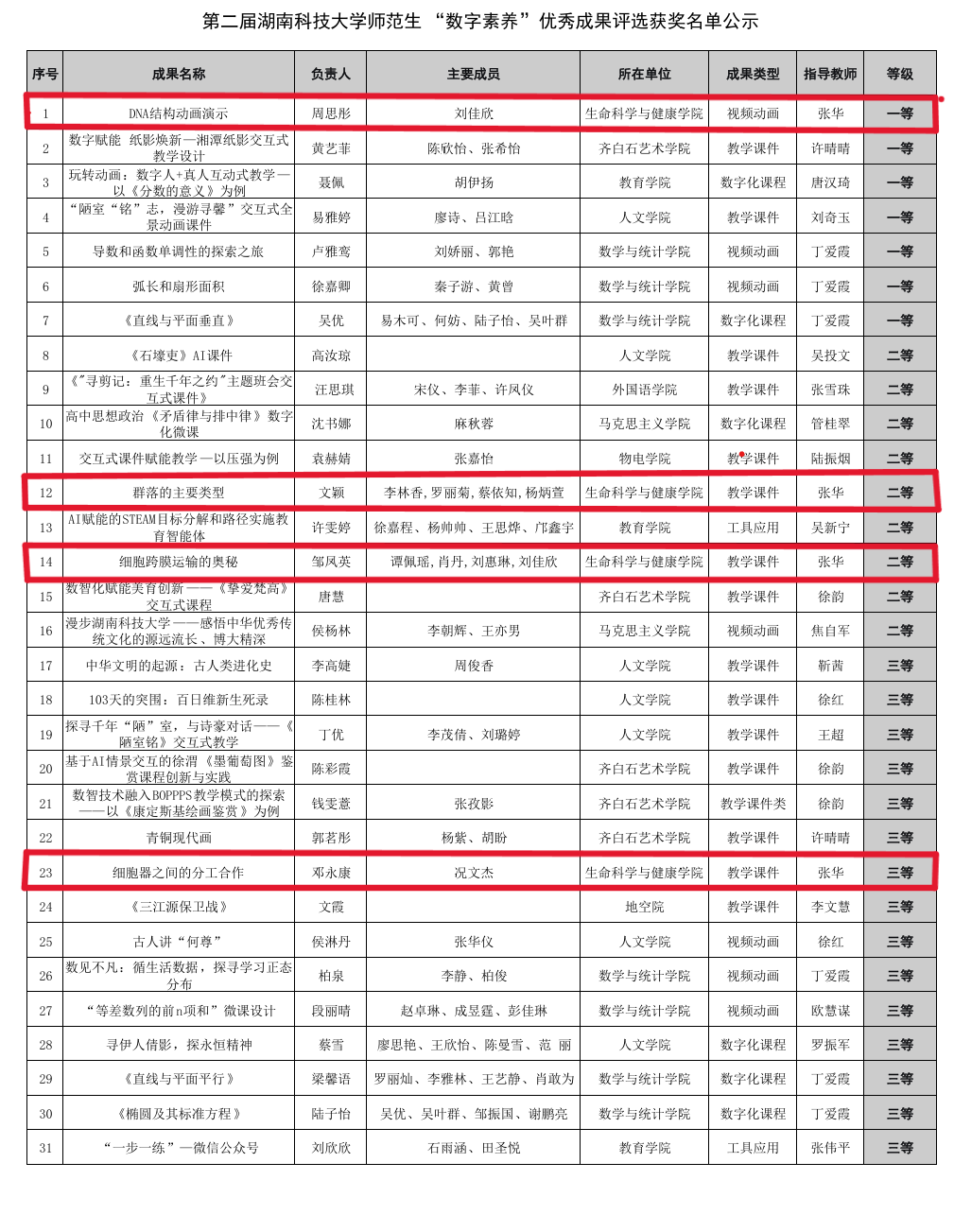12月3日,第二届湖南科技大学师范生“数字素养”优秀成果评选结果正式公布。足球直播吧 学子表现突出,凭借出色的数字化教学设计与技术应用能力,共斩获一等奖1项、二等奖2项,三等奖1项,展现了足球直播吧 在师范生培养与教育信息化融合方面的扎实成效。