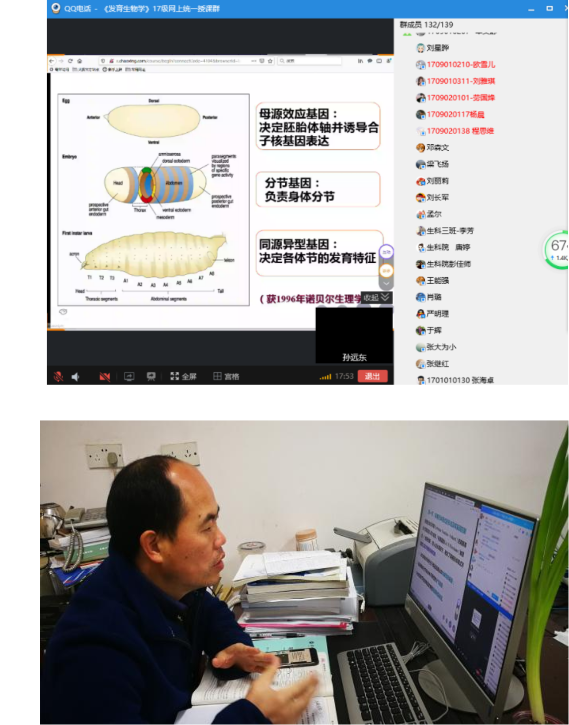 4月2日上午10点,360直播足球直播 本学期第一堂线上公开课在孙远东老师的发育生物学QQ学习群里开播了。课堂里,孙老师细致的讲解了果蝇形体模式的形成及其基因控制,在师生互动环节中学生主动分享了相关专业人物的科研小故事,专业学习和课程思政结合的紧密无痕。